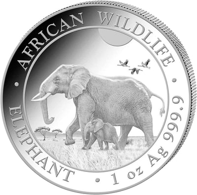 Die Gestaltung der 1 Unze Silber Somalia Elefant 2022 ist sehr filigran und wunderschön anzusehen. Auf der Motivseite ist ein großer Elefant mit einem kleinen Kalb zu sehen, beide laufen gemächlich durch die Steppe von Afrika. Der Schriftzug „African Wildlife“ ist am oberen Münzrand lesbar, die Kennzeichnung „Elephant“ unten. Hinzu kommen noch das Gewicht von 1 oz sowie der Feinheitsgrad von 999,9. Auf der anderen Münzseite ist oben der Schriftzug „Somali Republic“ zu sehen, in der Mitte das Somalische Staatswappen, gehalten von zwei Leoparden auf den Hinterbeinen. Das Prägejahr 22 sowie der Nennwert von 100 Shillings stehen am unteren Münzrand. Mit insgesamt 39,00 mm Durchmesser ist die Münze relativ groß und bietet Ihnen eine sehr hohe Prägequalität. Besonders Sammler lieben das Motiv der 1 Unze Silber Somalia Elefant, weshalb sich der Wert der Münzen nach der Ausgabe meist sehr schnell nach oben entwickelt.