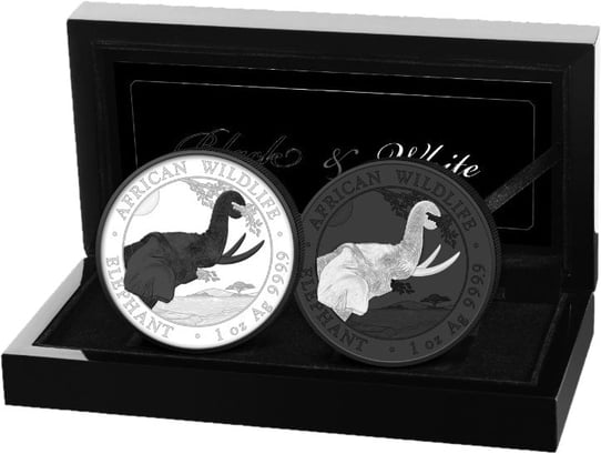 Bei den Somalia Elefant Silbermünzen, die in diesem Set vorhanden sind, handelt es sich aber nicht um die gewöhnlichen Somalia Elefant Münzen, sondern um ganz besondere Ausgaben des Anlageklassikers. Die Ausgaben stehen unter dem Motto „Schwarz und Weiß“ und sollen diesen Kontrast verkörpern.