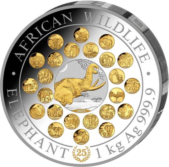 Diese teilvergoldete Silbermünze feiert das 25. Jubiläum der äußerst beliebten African Wildlife Serie aus Somalia, die jedes Jahr mit einem neuen Elefanten-Motiv aufwartet und bei Anlegern sehr gefragt ist. Die Münze, geprägt aus einem Kilo 99,99% reinem Silber in polierter Platte, zeigt mittig das 2023er Elefanten-Design, welches von den bisher erschienenen Ausgaben in kleinerer Ausführung umgeben wird. Insgesamt sind 25 vergoldete Elefanten-Motive auf der Münze zu sehen. Die Aufschriften „AFRICAN WILDLIFE“ und „ELEPHANT“, sowie das Gewicht „1 kg“, die Feinheit „Ag 999.9“ und das Emblem zum 25. Jubiläum befinden sich entlang des Münzrandes. Die Rückseite zeigt das somalische Staatswappen, welches einen Schild mit einem innenliegenden Stern abbildet, der von zwei Leoparden gestützt wird. Unterhalb dieses Symbols sind zwei traditionelle Speere und zwei Palmenblätter in gekreuzter Form zu sehen. Am äußeren Randbereich sind die Angaben zu Herkunftsland, Prägejahr und Nennwert zu finden: „SOMALI REPUBLIC 2023 2.000 SHILLINGS“.