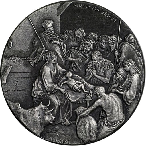 Historisches Kunstwerk: Meisterhaft gestaltet von Raphael Maklouf, inspiriert von Gustave Doré, fängt die Münze die Geburt Jesu in Hochrelief-Antik-Prägung ein