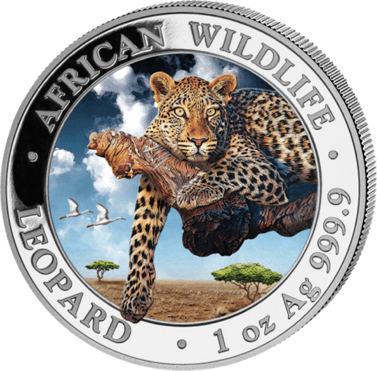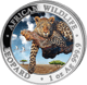 Auf der colorierten Münzseite ist eine Leopardenmutter zu sehen, die mit Ihrem Jungtier, auf einem Geröllboden liegt. Das Jungtier streicht seiner Mutter liebevoll mit der Tatze über das Gesicht. Im Hintergrund ist der Sonnenaufgang zu beobachten, der das Gebirge und die Steppenlandschaft langsam in das Licht des Tages hüllt. Durch die Colorierung bekommt diese Szene einen lebendigeren Charakter und man fühlt sich nach Afrika versetzt. Auf dem Rand steht der Schriftzug African Wildlife – Leopard, die Gewichtsangabe 1 oz und die Feinheit des Silbers 999,9.