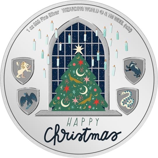 Auf der Motivseite der Silbermünze ist in Farbe ein großer Weihnachtsbaum eingeprägt, der mit Sternen, Schneeflocken und Phönixen geschmückt ist. Links und rechts können Sie die Symbole der vier Hogwarts™-Häuser sehen: Ravenclaw™, Hufflepuff™, Gryffindor™ und Slytherin™.