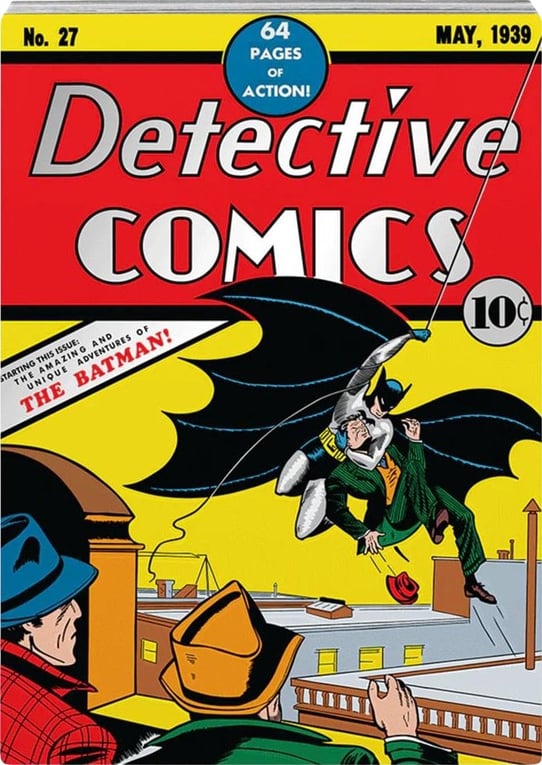 Comic-Kultobjekt: Farbiges Motiv des ersten Batman™ Auftritts, einzigartig für Fans