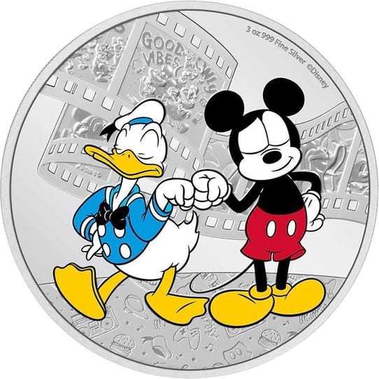Die Münze zeigt eine liebevoll gestaltete Szene mit Mickey Mouse und Donald Duck. Die beiden Charaktere sind in ihren klassischen Outfits dargestellt und strahlen eine unwiderstehliche Fröhlichkeit aus. Im Hintergrund ist eine Filmrolle zu sehen, die mehrere Ausschnitte aus den lustigen Abenteuern der beiden Figuren zeigt. Die Münze ist teilweise coloriert, was den Figuren und Szenen noch mehr Leben und Tiefe verleiht.