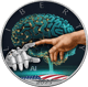 Die Vorderseite der Münze präsentiert ein bedeutungsvolles Design, das die Vernetzung von menschlicher und künstlicher Intelligenz symbolisiert. Eine menschliche und eine Roboterhand berühren sich, während im Hintergrund ein Gehirn mit maschinellen Strukturen abgebildet ist. Dieses Motiv verweist auf die Kommunikation zwischen Mensch und KI und die sich daraus ergebenden Möglichkeiten und Herausforderungen.