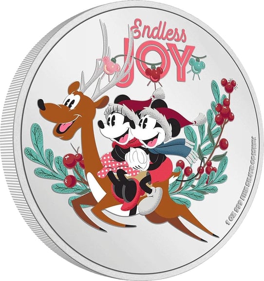 Die Vorderseite dieser Münze zeigt ein liebevoll gestaltetes Motiv, das Mickey und Minnie in Weihnachtsmützen auf einem Rentier darstellt. Dieses farbenfrohe Design wird von den Aufschriften "ENDLESS JOY" sowie dem Gewicht und der Feinheit der Münze umrahmt. Die Rückseite der Münze präsentiert das offizielle Wappen von Niue sowie den Nennwert und das Ausgabejahr.