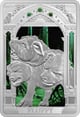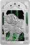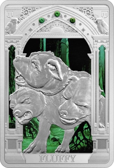 Die Vorderseite der Münze zeigt Fluffy, den furchteinflößenden, aber treuen dreiköpfigen Wachhund, bekannt aus dem ersten Abenteuer der Harry Potter-Serie. Die detailreiche und colorierte Gestaltung, kombiniert mit einem Hintergrund in mystischen Grüntönen, lässt das Motiv lebendig werden. Über dem Bildnis von Fluffy glitzern drei grüne Zirkoniasteine, die ein zusätzliches Highlight setzen und die Exklusivität des Sammlerstücks unterstreichen.