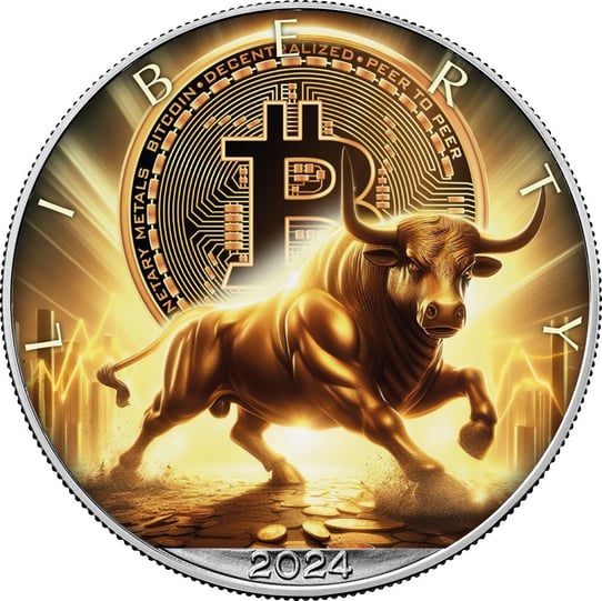 Das farbige Motiv auf der Vorderseite dieser Silbermünze ist ein wahres Kunstwerk. Es präsentiert einen strahlenden goldenen Bullen im Vordergrund und den Hintergrund ziert die Krypto-Währung „Bitcoin“. Der Bulle symbolisiert den sogenannten „Bullenmarkt“, der in der Börsensprache für steigende Kurse steht. Die Aufschriften „LIBERTY“ und „2024“ runden das Design ab.