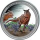 Das colorierte Motiv der Silbermünzen zeigt zwei mächtige Carnotauren bei der Jagd auf kleinere Dinosaurier. Die detailreiche Gestaltung und die lebendige Farbgebung lassen die prähistorische Szene regelrecht lebendig werden. Die charakteristischen Merkmale des "fleischfressenden Stiers" - wie die markanten Stirnhörner und der muskulöse Körperbau - sind dabei besonders eindrucksvoll herausgearbeitet.