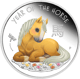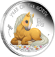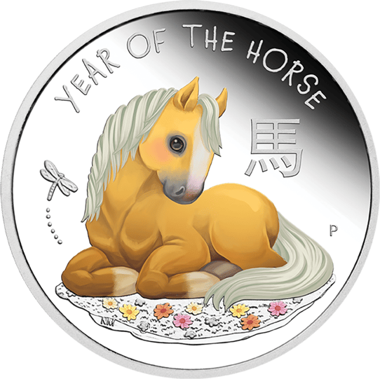 Das entzückende Motiv zeigt ein goldgelbes Baby-Pferd, das friedlich auf einer blumenübersäten Wiese ruht. Die seidig schimmernde Mähne und der Schweif des kleinen Fohlens sind in zartem Silbergrau gehalten. Eine verspielte Libelle schwebt links neben dem Pferdchen und verleiht der Szene zusätzliche Lebendigkeit. Das chinesische Schriftzeichen für "Pferd", die Aufschrift "Year of the Horse" sowie das renommierte Münzzeichen "P" der Perth Mint runden das kunstvolle Design ab.