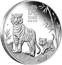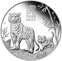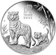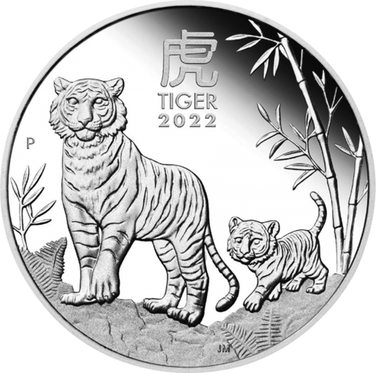Das Motiv der Münze zeigt einen stolzen Tiger und sein Junges, die durch ein felsiges Gelände mit Farnen und Bambus wandern. Dieses Bild steht symbolisch für die Stärke und den Schutz, den der Tiger seinem Nachwuchs bietet. Die Inschrift "TIGER 2022" und das chinesische Schriftzeichen für "Tiger" sind ebenfalls auf der Münze abgebildet, ebenso das Münzzeichen "P" der Perth Mint.
