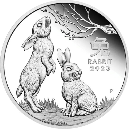 Die Motivseite der Silbermünze „Jahr des Hasen“ zeigt zwei Hasen. Ein Hase streckt sich zu einem Ast, um Knospen zu fressen, während der andere Hase mit aufgerichteten Ohren aufmerksam die Gegend zu beobachten scheint. Rechts vom Motiv ist das chinesische Schriftzeichen für „Kaninchen“, die Aufschrift „RABBIT 2023“ und das Prägezeichen „P“ der Perth Mint zu sehen. Die Wertseite hingegen zeigt das Jody-Clark-Bildnis Ihrer Majestät Königin Elizabeth II., das Gewicht „1oz“ und den Feingehalt „9999 Ag“, sowie den Nennwert „8 DOLLARS“.
