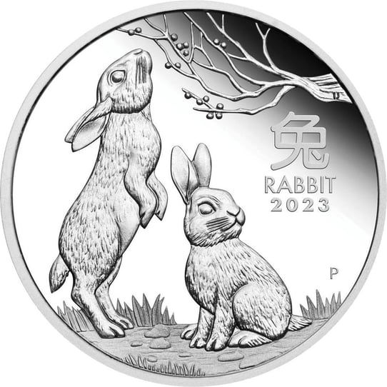 Auf der schönen Vorderseite der Silbermünze sind zwei Hasen abgebildet, die sich auf einer Wiese befinden. Ein Hase streckt sich empor, um an eine Beere zu gelangen, während der andere entspannt auf dem Gras sitzt und zur Seite schaut. Über dem zweiten Hasen sind das chinesische Symbol für Hase und das Prägejahr der Münze, 2023, zu sehen.