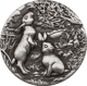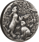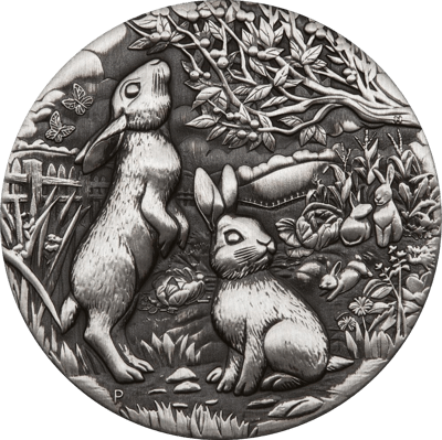 Auf der Motivseite dieser Silbermünze sind gleich mehrere Hasen eingeprägt. Zwei sind groß im Vordergrund zu sehen. Einer von ihnen sitzt auf dem Boden und schaut zur Seite, als würde er etwas oder jemanden beobachten. Der andere Hase macht Männchen, um an die Beeren und Blätter eines Baumes heranzukommen. Die Hasen befinden sich in einem wunderschönen Garten voller Blumen und Gemüse, wie zum Beispiel Salat und Mais. Der Garten ist mit einem Holzzaun abgegrenzt. Im Hintergrund ist zu sehen, wie viele andere Hasen im Garten herumtollen. Zwei Schmetterlinge fliegen über die Köpfe der Nagetiere her. Der Himmel ist nur leicht bewölkt. Es scheint ein schöner Sommertag zu sein.