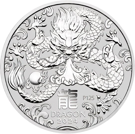 Die Vorderseite der 5 Unzen schweren Silber Lunar Münze zeigt einen beeindruckenden Drachen, der inmitten von Wolkenmustern mit aufgerissenem Maul und lodernden Flammen eingebettet ist. Die fein ausgearbeiteten Schuppen und der gewundene Körper des Drachens zeugen von der meisterhaften Handwerkskunst der Perth Mint. Chinesische Schriftzeichen und die Inschrift "DRAGON 2024" verleihen der Münze einen Hauch von Exotik und Authentizität.