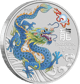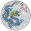 Auf der Vorderseite dieser außergewöhnlichen Münze thront ein farbenprächtiger Drache, der in dynamischer Pose dargestellt ist. Der Drache, ein Symbol für Macht, Glück und Wohlstand in der chinesischen Kultur, ist in lebendigen Blautönen gehalten, die durch grüne und gelbe Akzente ergänzt werden. Die detaillierte Schuppenstruktur und die langen, weißen Barthaare verleihen dem Drachen eine beeindruckende Realitätsnähe. Er windet sich um eine rote und weiße Perle, die das klassische Yin-Yang-Symbol darstellt – ein weiterer Hinweis auf die tiefe kulturelle Bedeutung dieses Motivs.