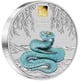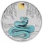Die Vorderseite der Münze zeigt eine majestätische Schlange in einer atemberaubenden türkisblauen Colorierung. Das detailreiche Schuppenmuster und die geschmeidige Körperhaltung des Tieres werden durch die Farbgebung besonders eindrucksvoll hervorgehoben. Über der Schlange schweben zarte Weidenblätter, die dem Motiv eine poetische Note verleihen. Ein besonderes Highlight ist das goldene Privy Mark mit dem chinesischen Schriftzeichen für "Schlange".