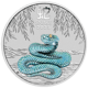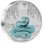 Das Herzstück dieser Rarität ist die meisterhaft colorierte Darstellung einer majestätischen Schlange. In schillernden Türkis- und Blautönen windet sich das imposante Reptil vor einem kunstvoll gestalteten Hintergrund mit filigranen Weidenzweigen. Die aufwändige Colorierung verleiht der Münze eine außergewöhnliche Tiefenwirkung und macht sie zu einem wahren Blickfang in jeder Sammlung.