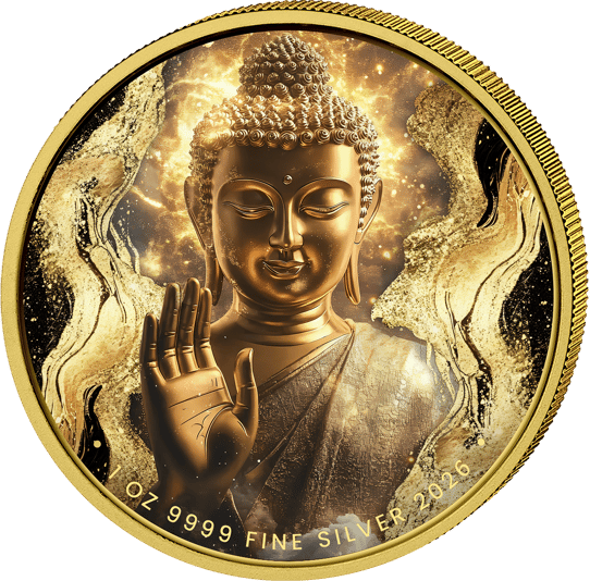 Werfen Sie einen Blick auf die Bildseite dieser Münze, und Sie werden verstehen, warum sie so besonders ist. Ein goldener Buddha blickt dem Betrachter mit geschlossenen Augen und einem sanften, friedvollen Lächeln entgegen. Seine rechte Hand ist in der klassischen Abhaya-Mudra erhoben – der Geste der Furchtlosigkeit und des Schutzes. Die aufwendige Teilvergoldung lässt die Buddha-Figur regelrecht aus der Münze hervortreten, während der Hintergrund in fließenden Gold- und Schwarztönen gestaltet ist, durchzogen von kosmischen Lichtpartikeln. Es wirkt beinahe so, als würde die Figur in einem Strom aus flüssigem Gold schweben. Am unteren Rand findet sich die Inschrift „1 OZ 9999 FINE SILVER 2026".