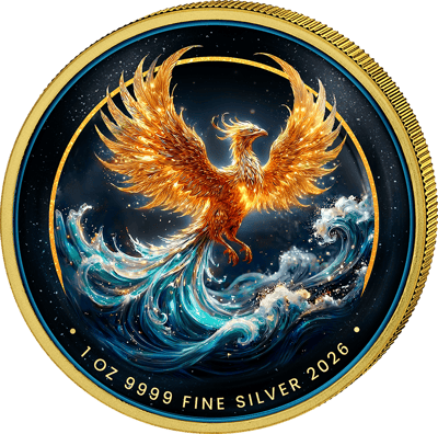 1 Unze 999,9er Feinsilber mit faszinierendem Phoenix-Motiv in Gold, Orange und Blau – ein echtes Kunstwerk