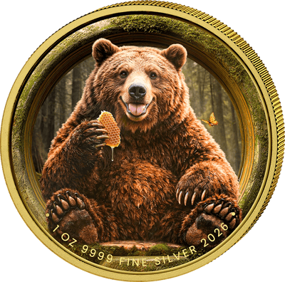 Die Inschrift „1 oz 9999 FINE SILVER 2026" auf der Vorderseite sowie „20 DOLLARS" auf der Rückseite bestätigen sowohl den Edelmetallgehalt als auch den Nennwert. Jedes noch so kleine Detail – von den einzelnen Fellhaaren des Bären bis zu den herabtropfenden Honigtropfen – zeugt von höchster handwerklicher Präzision.