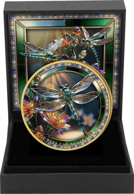 - Motiv: Eine atemberaubende Kristalllibelle, deren filigrane Flügel und schillernder Körper inmitten kristalliner Blüten schweben – ein Meisterwerk der Münzkunst, das Natur und Juwelierhandwerk verschmelzen lässt.