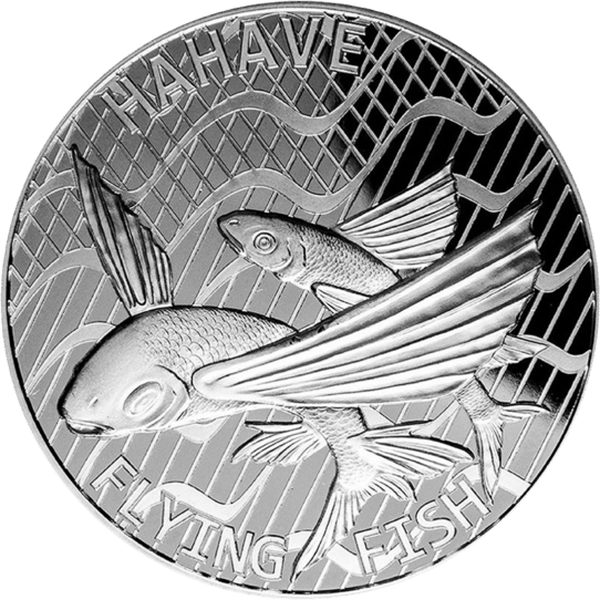 Die 2020er Münze zeigt uns zwei fliegende Fische. Man sollte bedenken, dass fliegende Fische nicht mit den Brustflossen schlagen, um ähnlich wie Vögel aktiv zu fliegen können, sondern sie katapultieren sich mit einem Sprung aus dem Wasser und segeln kurze Strecken im Gleitflug über die Wasseroberfläche.