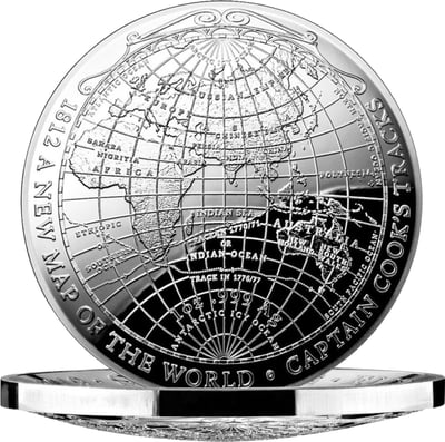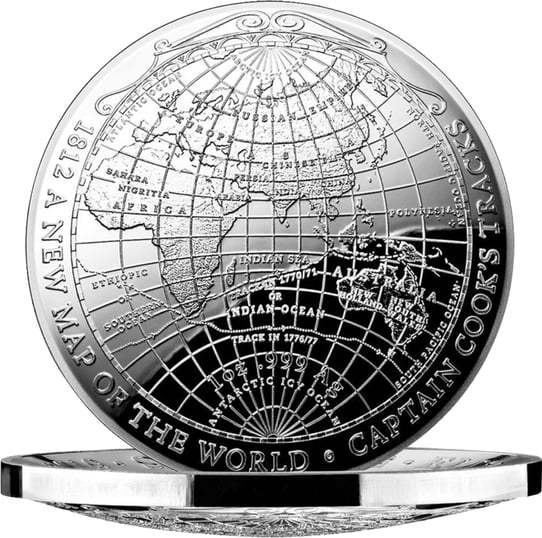 Die 1 Unze Silber 1812 Neue Weltkarte als „Polierte Platte“ ist 31,10 Gramm schwer und das Ausgabejahr 2019. Die Münze wird von der Royal Australian Mint geprägt. Es handelt sich hierbei um eine neue Weltkarte aus dem Jahr 1812, welche im 18. Jahrhundert die berühmten Reisen von Kapitän James Cook und die Phantasie etlicher Generationen enthüllte. Die Weltkarte stellt die bis dato geheimen Teile der südlichen Hemisphäre dar. Die Aufregung und das Drama dieser Entdeckungszeit wird mit dieser exklusiven und gewölbten Weltkarten-Münze verkörpert. Die gewölbte Silbermünze basiert auf seltenen und historischen Karten aus dem 18. Jahrhundet, welche damals schon sehr genau waren.