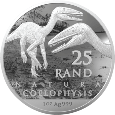 Auf dem Motiv der 25 Rand Silbermünze ist ein Coelophysis Rhodesiensis abgebildet. Das Reptil lebte vor etwa 235 Millionen Jahren in der mittleren Triaszeit und war eines der ersten zweibeinigen Wirbeltiere, deren Beine länger waren als ihre Arme. Alle Ausgaben der Serie haben die gleiche Vorderseite, welche den Kopf eines Erythrosuchus africanus Sauriers zeigt.