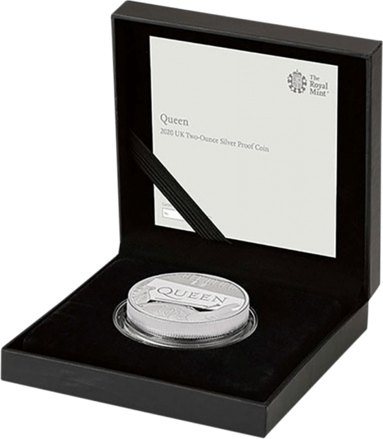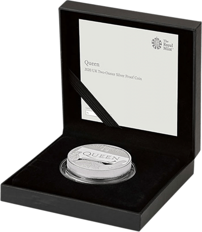 Das Prunkstück der Serie ist die 2 Unzen Goldmünze in Polierter Platte mit einer Auflage von 53 Stück weltweit, so zu sagen die Killer Queen der Münzen. Um aber auch den Silberliebhaber eine angemessene Münze präsentieren zu können, hat die Royal British Mint diese 2 Unzen Silber Münze auf den Markt gebracht. Auf der Rückseite der Münze sind die Instrumente zu sehen, welche von den vier Musikern benutzt wurden. Am Bass John Deacon, das Schlagzeug spielte Roger Taylor, an der E-Gitarre war Brian May und am Klavier Freddy Mercury. Den Gesang teilten sich die vier Musiker, wobei die meisten Lieder von Freddy Mercury gesungen wurden. In der Mitte der Münze ist der Schriftzug “Queen” zu lesen. Auf der Vorderseite der Münze ist das Portrait der Queen Elisabeth II. zu sehen mit dem Jahrgang und dem Nennwert.