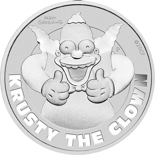 Krusty, dem diese Münze gewidmet wurde, ist eine der bekanntesten Nebenrollen aus der Serie. Seit 1989 ist der zynische und von Sucht geplagte Clown, Bestandteil der Simpsonsserie. Als Herschel Shmoikel Pinchas Yerucham Krustofsky, kam er in Springfield auf die Welt und bekam auf Chanel 6 seine eigene Serie, die “Krusty the Clown Show”, aus der auch, die von Bart und Lisa, gerne gesehenen Zeichentrickfiguren Itchy und Scratchy, hervorgehen. Matt Groening, der Erschaffer der Simpsons, hat Krusty extra aussehen lassen wie Homer Simpsons, da er wollte, dass Bart jemanden verehrt, der aussieht wie sein Vater in Clownskostüm.