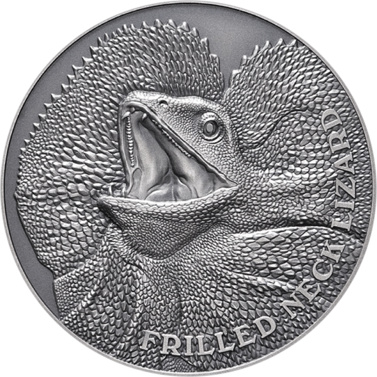 Die Reise durch die Tierwelt Australiens geht weiter und die dritte Münze der Serie “Australian Wildlife” zeigt uns die Kragenechse, oder Frilled Neck Lizard auf englisch. Die Kragenechse ist eine in Australien und Neuguinea heimische, rund 1 m lang werdende Art der Schuppenkriechtieren. Die Echse ist bekannt für ihre Fähigkeit, eine große Halskrause regenschirmartig aufzustellen. Dieser „Kragen“ wird von einer großen Hautmembran gebildet, welche von knorpeligen Stäben gestützt wird. Das plötzliche Aufspannen des Kragens durch Kontraktion von an den Knorpelstäben anhängenden Muskeln lässt die Echse größer erscheinen und schreckt Feinde ab, spielt aber auch in der innerartlichen Kommunikation eine Rolle.