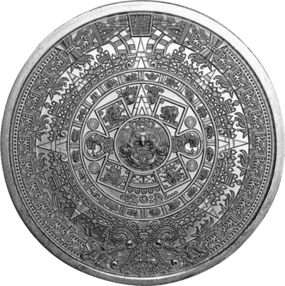 Wie die anderen indogenen Kalender aus Mittelamerika besteht der Azteken-Kalender aus zwei miteinander verschränkten Zyklen, dem oft so bezeichneten bürgerlichen Jahr, von unveränderlich 365 Tagen Dauer und einem Ritualkalender von ebenfalls unveränderlich 260 Tagen Dauer. Was auf der Motivseite der Medaille zu sehen ist. Auf der Anderen Seite ist das Portrait von Cuauhatemoc, dem letzten aztekischen Herrscher.