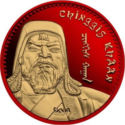 Historische Eleganz: Vergoldetes Konterfei von Dschingis Khan auf leuchtend rotem Hintergrund, ein Kunstwerk in Münzform