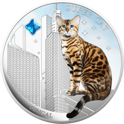 Detailreiche Prägung: Hochwertige Darstellung einer Bengal-Katze in Polierter Platte, verziert mit einem blauen Edelstein für Sammler mit Sinn für Ästhetik