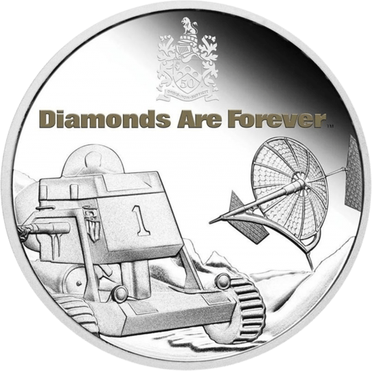 Auf der Motivseite ist zum einen das Mondfahrzeug zu sehen und zum anderen der Satellit, um den sich der Diamantenraub letztlich dreht. Denn mit der Beute soll ein technisch weit überlegener Satellit gebaut werden, um die Macht des Bösen auszuweiten. Mit dem Familienwappen von James Bond, das sich oben auf der Münze befindet, sind letztlich alle wichtigen Elemente der legendären Geheimagenten-Serie stilvoll vereint. Auf dem Familienwappen von Bond steht in Latein „Orbis Non Sufficit“ und damit „Die Welt ist nicht genug“. Nicht zu vergessen ist der vergoldete Schriftzug „Diamonds Are Forever“. Die Wertseite ziert das Porträt von Queen Elizabeth II. Rund um das Porträt stehen die Schriftzüge „2021“,  „1oz 9999 Ag“, „QUEEN ELIZABTEH II“, „1 DOLLAR“, sowie „TUVALU“. Tuvalu ist dabei ein Inselstaat im Pazifischen Ozean.
