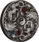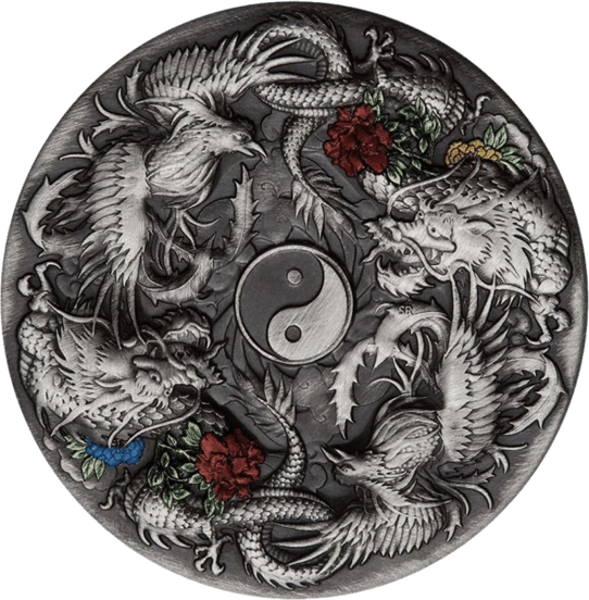 Die Legende wird auf der Vorderseite regelrecht zum Leben erweckt. So realistisch sind die zwei Drachen und zwei Phönix-Vögel abgebildet worden. Durch die Teilcoloration wird ein zusätzlicher Akzent gesetzt, der die Besonderheit der Legende und der Silbermünze unterstreicht. Im Zentrum der Münze findet sich das ebenfalls sehr detailreich herausgearbeitete Yin-Yan-Symbol. Die zwei Drachen und die zwei Phönix-Vögel liegen sich in der Szene jeweils gegenüber.