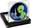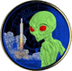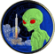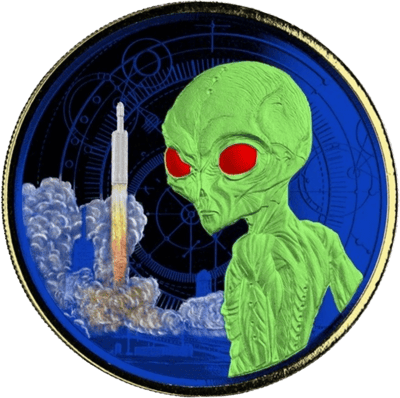 Die Vorstellung, dass Aliens eines Tages auf die Erde kommen könnten, oder bereits sogar schon auf der Erde waren, wurde bereits in vielen Filmen und Büchern aufgegriffen. Meistens werden Aliens als bösartige, seltsam aussehende Wesen dargestellt, die Menschen entführen, um dann an ihnen Experimente vorzunehmen. Meistens sehen Aliens sehr dünn und skelettartig aus, mit entweder einer grauen oder giftgrünen Haut und roten, leuchtenden Augen. Was das Alien auf der Motivseite dieser Silbermünze betrifft, so entspricht es mit seinem mageren Körper, seinen roten Augen und seiner grünen Haut definitiv den generellen Vorstellungen über das Aussehen eines Aliens. Sein Kopf ist für seinen zierlichen Körper viel zu groß und erinnert an einen Totenkopf. Seine Augen ähneln den Augen eines Insekts. Im Hintergrund wird gerade eine Rakete gestartet. Der Hintergrund leuchtet in einem metallischen Blau.