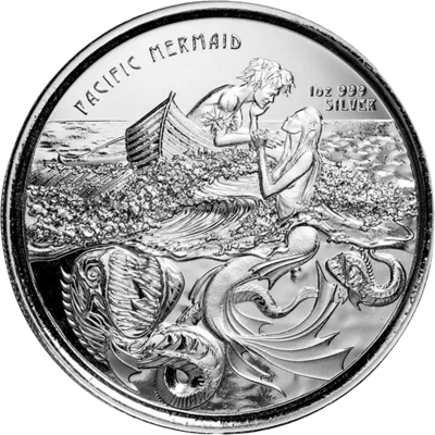 Es wird ein Mann in einem Ruderboot, das im Meer treibt abgebildet. Gleichzeitig erscheint eine einsame Meerjungfrau, die nach dem Seemann greift. Gefährliche Seeschlangen lauern unter dem Boot und runden das Motiv ab. Der Schriftzug “PACIFIC MERMAID” sowie die Bezifferung “1 oz 999 SILVER” sind zu erkennen.