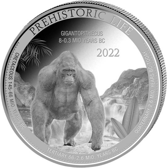 Unter der Bezeichnung Gigantopithecus versteht sich ein Menschenaffe der Vorzeit. Seine Überreste ließen sich im asiatischen Raum, unter anderem in Pakistan, China und in Nordindien finden. Die Knochenfunde des Gigantopithecus spielten in der asiatischen Medizin eine wichtige Rolle. Sie wurden als Drachenknochen angesehen, zerrieben und sollten eine hohe, heilsame Wirkung innehaben. Mit der vorliegenden Münze wird dem Gigantopithecus als wichtigem Vertreter des Prähistorischen Lebens besonderes Augenmerk gewidmet.