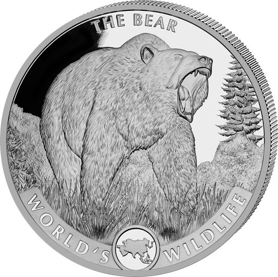 Der Grizzlybär ist ein kräftiges Raubtier und ein richtiger Kämpfer, weshalb er für Freiheit und Kraft steht. Aber nicht nur seine Stärken und sein dickes Fell, sondern auch seine Intelligenz machen ihn zum perfekten Überlebenskünstler. In den dunkelsten und kältesten Wäldern ist der Grizzlybär Zuhause. Aufgrund seiner vielseitigen symbolischen Bedeutung, ist der Grizzlybär ein beliebtes Wappentier und ziert auch die Vorderseite dieser Silbermünze. Um seine Stärke zu demonstrieren, lässt der darauf abgebildete Bär ein lautstarkes Gebrüll los.