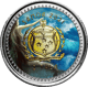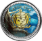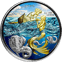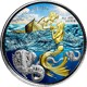 Das Meer ist an der Oberfläche türkisblau und am unteren Rand der Münze dunkelblau gefärbt, um die Tiefe des Ozeans darzustellen. In der Tiefe befinden sich gefährliche, silberne Seeungeheuer