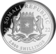 Auf der Rückseite der Münze können Sie das Wappen Somalias sehen, an dem sich zwei Leoparden festkrallen. Neben den Leoparden steht das Prägejahr der Münze (2022). Unter dem Wappen finden Sie den Nennwert des Produktes (2.000 Schillings).