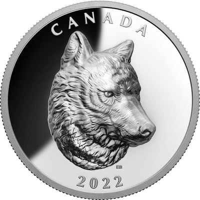Die Vorderseite der Silbermünze ist mit dem Kopf eines Timberwolfs geprägt. Dank des detaillierten Designs und dem High Relief wird ein starker Kontrast zwischen dem Motiv und dem Hintergrund hergestellt.