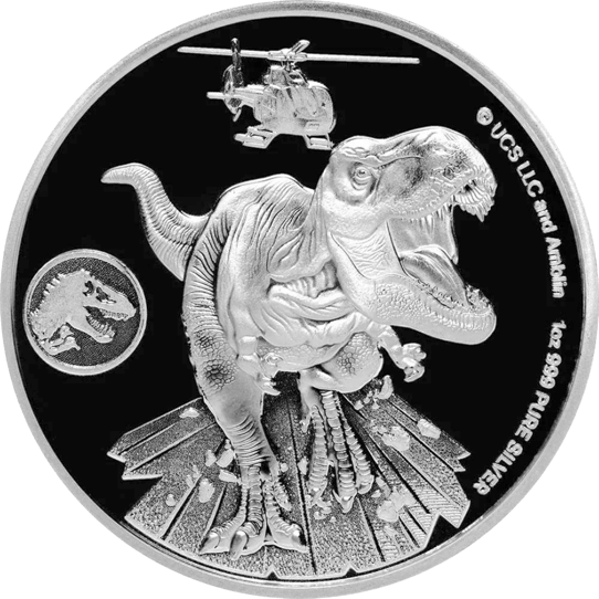 Die Szene, die auf der Vorderseite dieser Silbermünze dargestellt ist, stammt aus dem US-amerikanischen Science-Fiction-Film Jurassic World Domination™, der im Jahr 2022 herauskam. Es wird dargestellt, wie ein Hubschrauber einen riesengroßen Tyrannosaurus-Rex verfolgt.