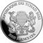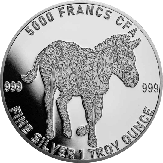 Rechts und links neben dem Zebra steht jeweils die Feinheit der Münze, die 99,9 % beträgt. Darüber ist der Nennwert von 5.000 Francs CFA eingeprägt.
