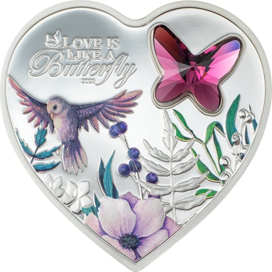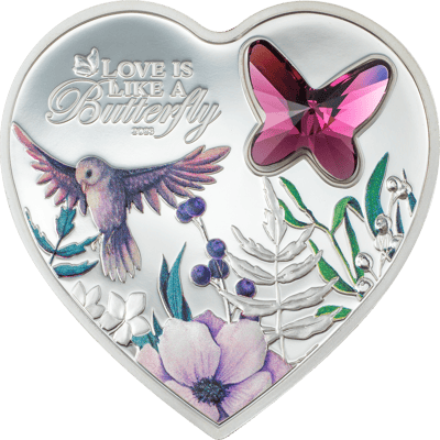 Die exklusive 1 Unze Silber Brilliant Love ist ein wahrhaft schönes Sammlerstück für alle Investoren und Silber-Liebhaber. Die begehrte Münze glänzt nicht nur mit ihrer präzisen Qualität, sondern auch mit ihrer colorierten Abbildung und dem einzigartigen Schmetterlingsmuster. Nicht nur ein Nennwert von 5 CID spricht für die limitierte Münze, sondern auch die stilvoll geformte Umrandung der Silbermünze wirkt hochwertig, schön auf all Ihre Liebsten. Auf der Motivseite befindet sich ein fliederfarbener Vogel, welcher sich langsam an die fein gezeichneten  Pflanzen nähert. Den Mittelpunkt der Münze macht der auffallende Schmetterlingkristall in Pink und die Aufschrift “Love is like a Butterfly”. Außerdem ist die Rückseite mit dem seitlichen Profil der verstorbenen Königin Elizabeth II, dem Herkunftsland Cook Islands sowie dem Nennwert „5 DOLLARS“ bestückt. Ein Geschenk, das Sie begeistern wird!