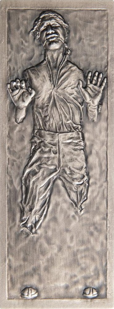 Die Münze präsentiert eine detailgetreue Nachbildung der berühmten Filmszene aus "Star Wars: Das Imperium schlägt zurück", in der Han Solo in Karbonit eingefroren wird. Der Barren ist in einem Antik Finish gehalten und zeigt Han Solo in voller Länge, eingefroren in Karbonit. Geprägt wurde die Münze von der renommierten New Zealand Mint und besteht aus 10 Unzen reinem Silber.