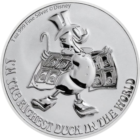 Wie diese Münze verrät, ist Dagobert Duck die reichste Ente der Welt und milliardenschwer. Trotz seines Vermögens ist die Ente jedoch sehr sparsam. Die Kleidung, die Dagobert Duck auf diesem Münzmotiv trägt, trägt er eigentlich immer. Seinen Zylinder und seinen Gehstock hat die Ente 1910 für nur zwei Dollar in Russland erworben. Auch der Gehrock war sehr billig. Den kaufte er 1902 gebraucht in Schottland. Dagobert Duck gibt nicht gerne Geld für unnötige Dinge aus, die er eigentlich gar nicht braucht. Er geht zum Beispiel auch lieber zu Fuß als teure Transportmittel zu benutzen.
