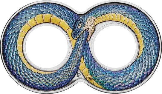Das attraktive Motiv in Farbe und Antik Finish zeigt eine einzigartige Schlange, die ihren eigenen Schwanz auf isst. Die edle Rückseite zeigt neben dem schönen Porträt Ihrer Majestät Königin Elizabeth II, die Feinheit, den Nennwert, das Gewicht und das Ausgabejahr.